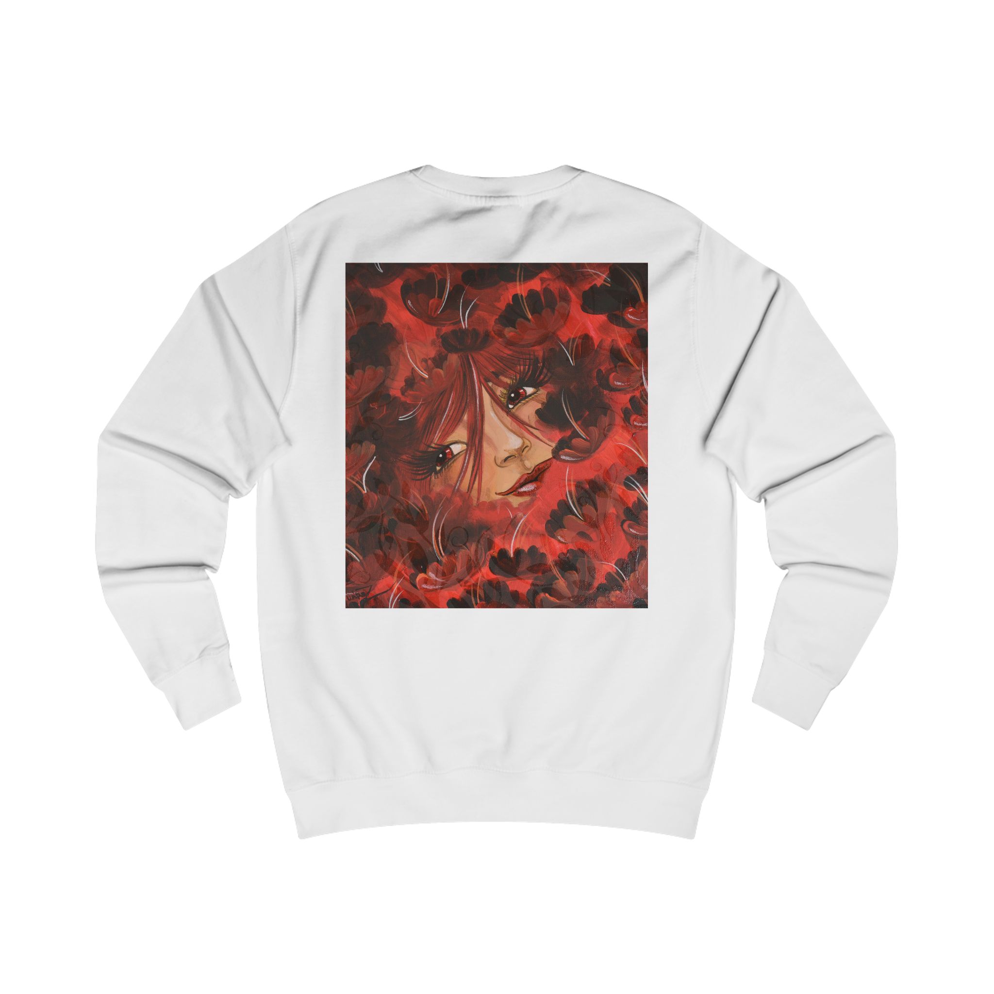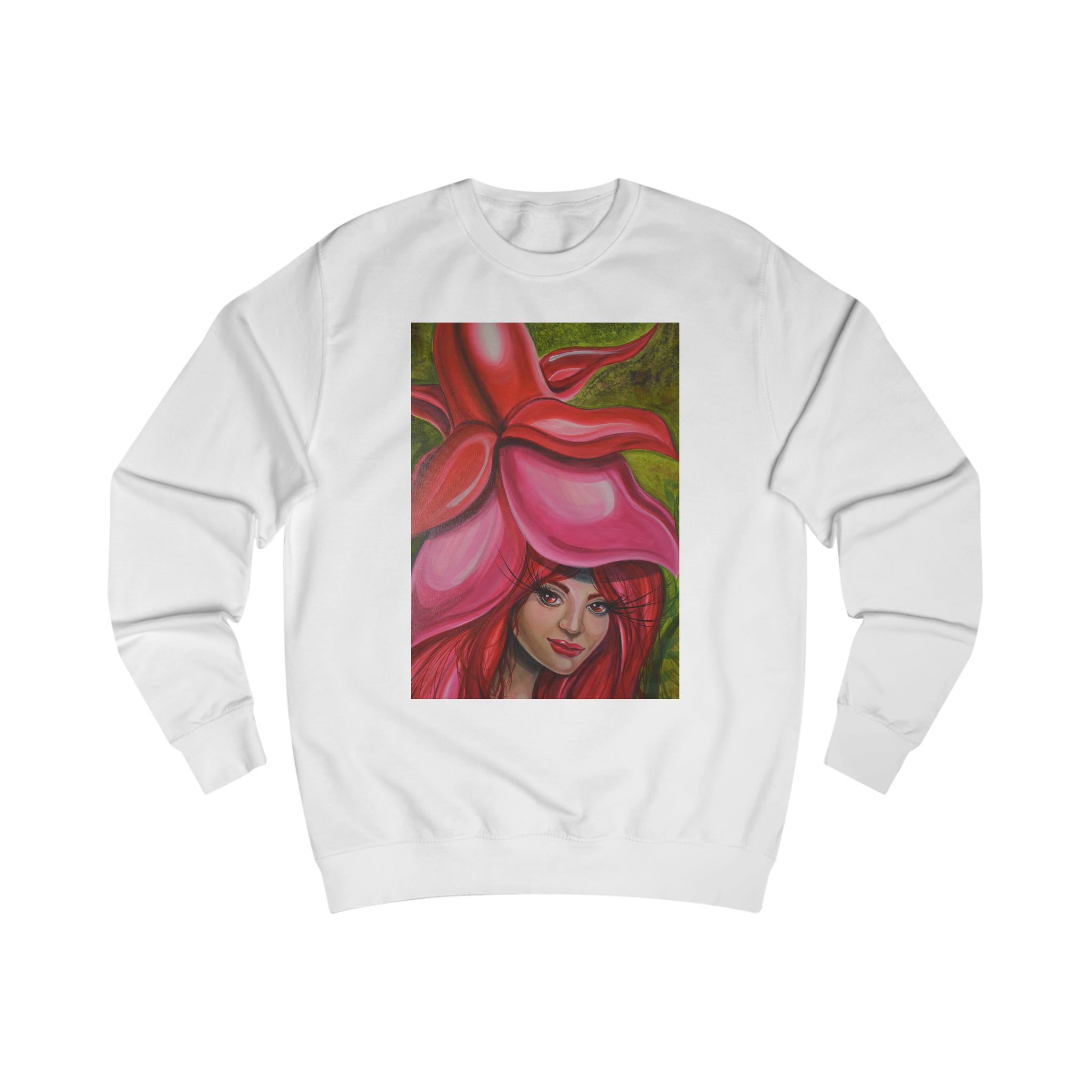 Cozy sweatshirt features an original acrylic painting from Rubí Juárez’s Träumen Garten series.